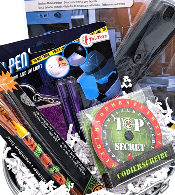 Voor nieuwsgierige speurneuzen, geheime agenten en stille onderzoekers in opleiding! Deze Bucket in Spionage-stijl zit vol gadgets en tools om elk mysterie op te lossen — van geheime codes tot verborgen schatten.