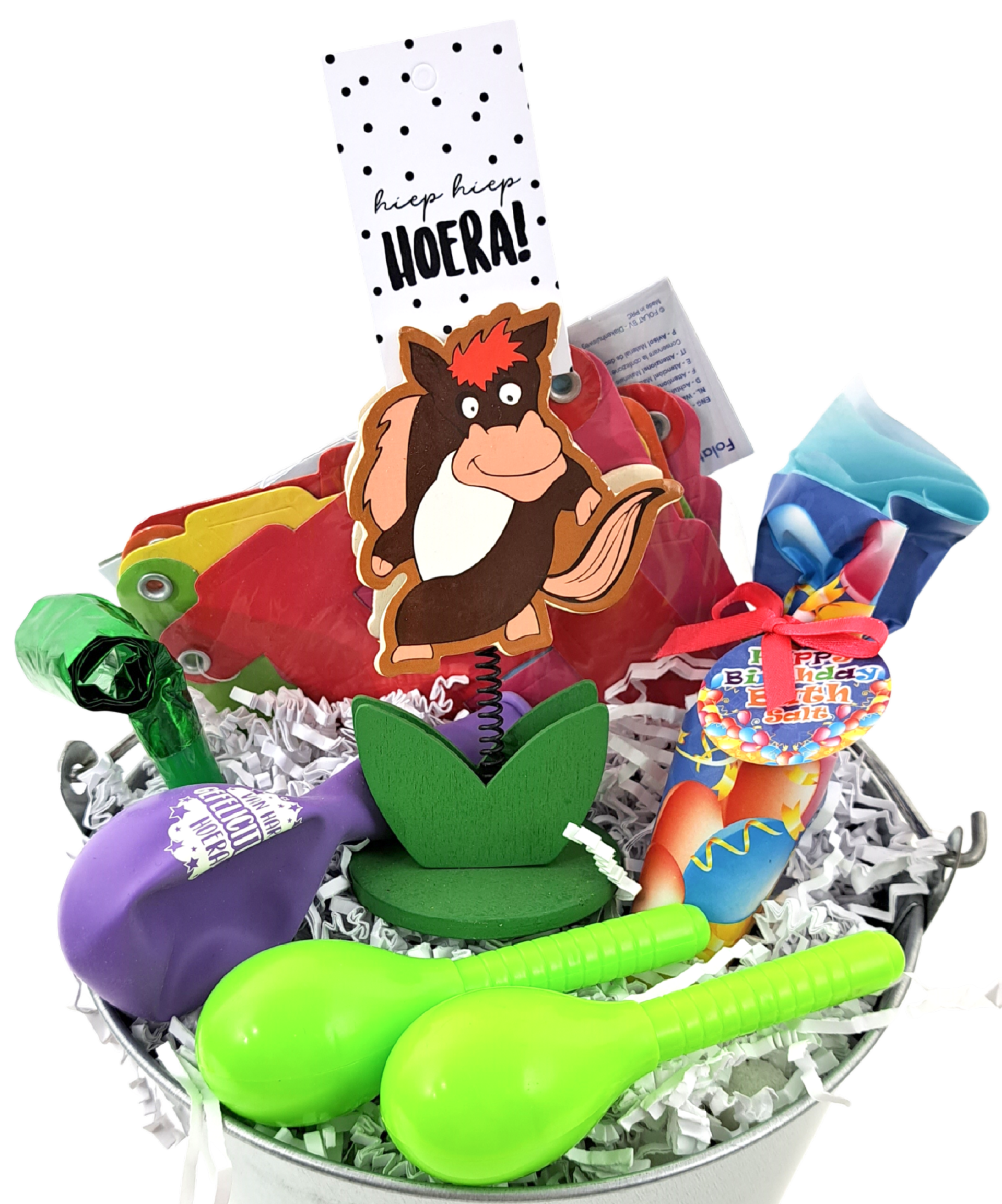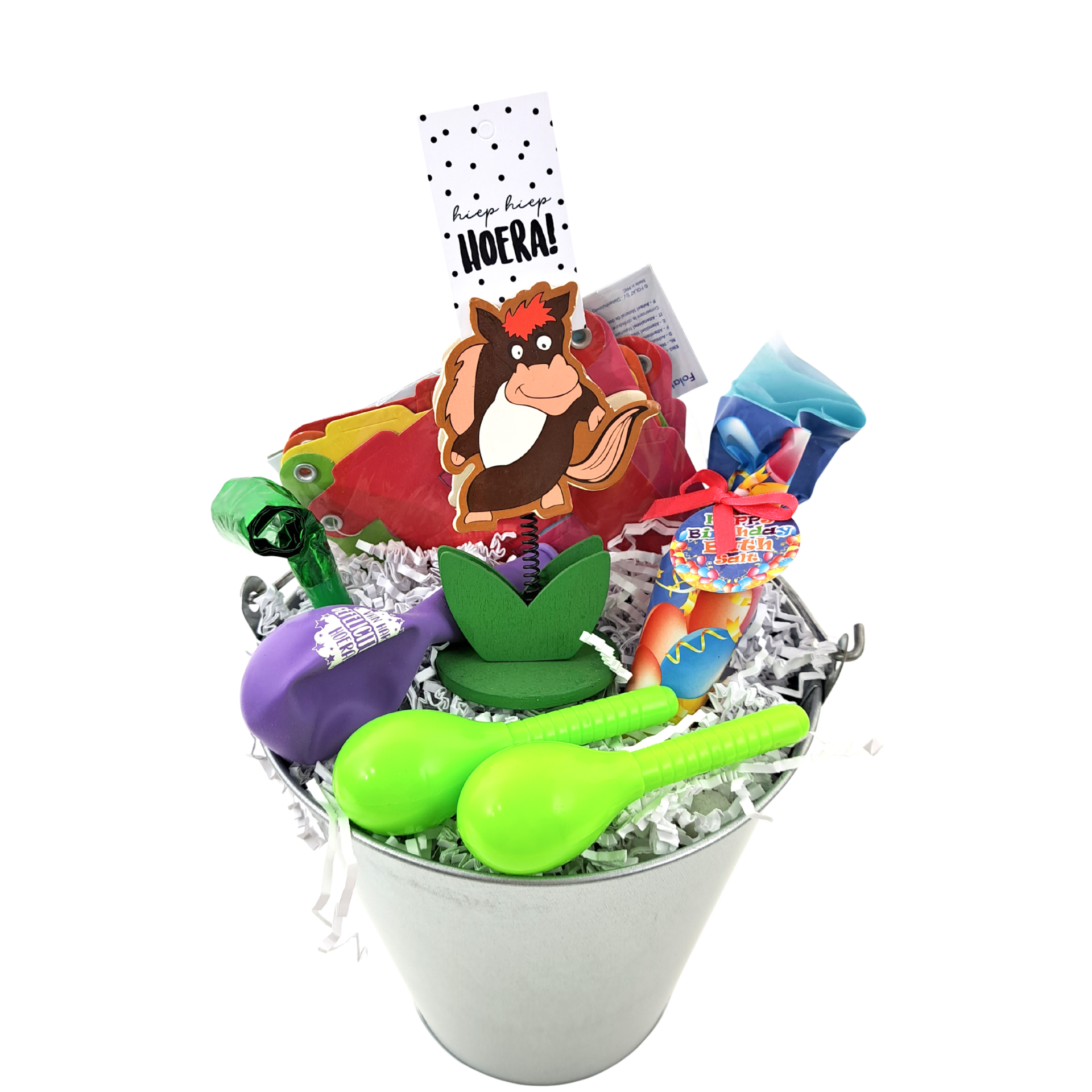 Deze bucket is voor de jarige, zodat hij/zij er zelf een feestje van kan maken.