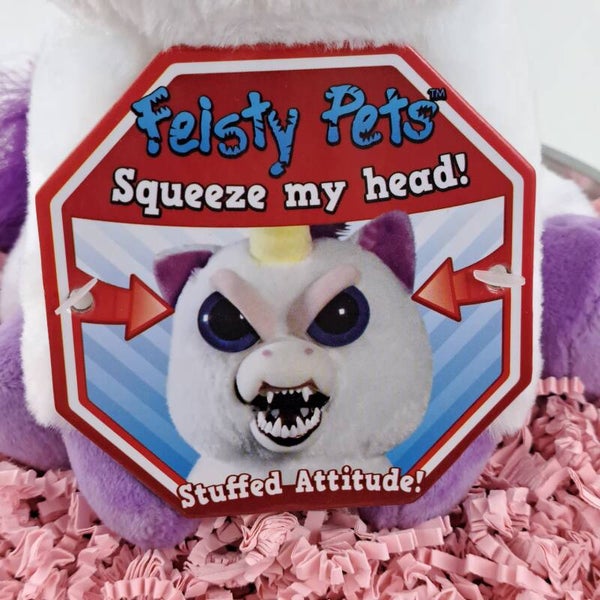 🦄 Feisty Eenhoorn – Knijp in zijn achterhoofd en hij verandert in een boze eenhoorn. Leuk om iemand te laten schrikken, maar ook handig om gevoelens te communiceren.