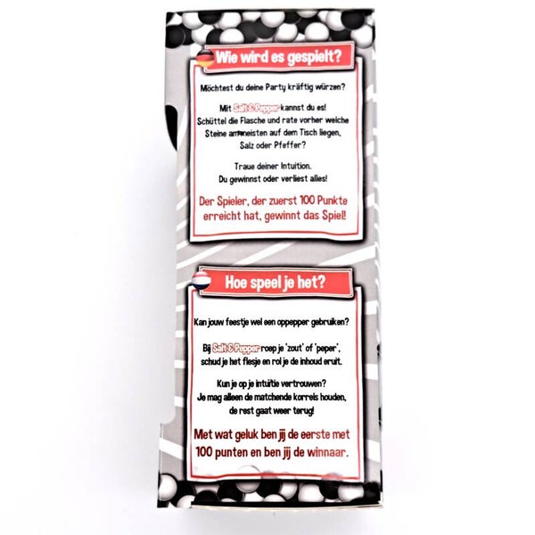 Kan jouw feestje wel een oppepper gebruiken? Bij Salt & Pepper roep je 'zout' of 'peper', schud je het flesje en rol de inhoud eruit. Kun je op je intuïtie vertrouwen? Je mag alleen de matchende korrels houden, de rest gaat weer terug! Met wat geluk ben jij de eerste met 100 punten en ben jij de winnaar.